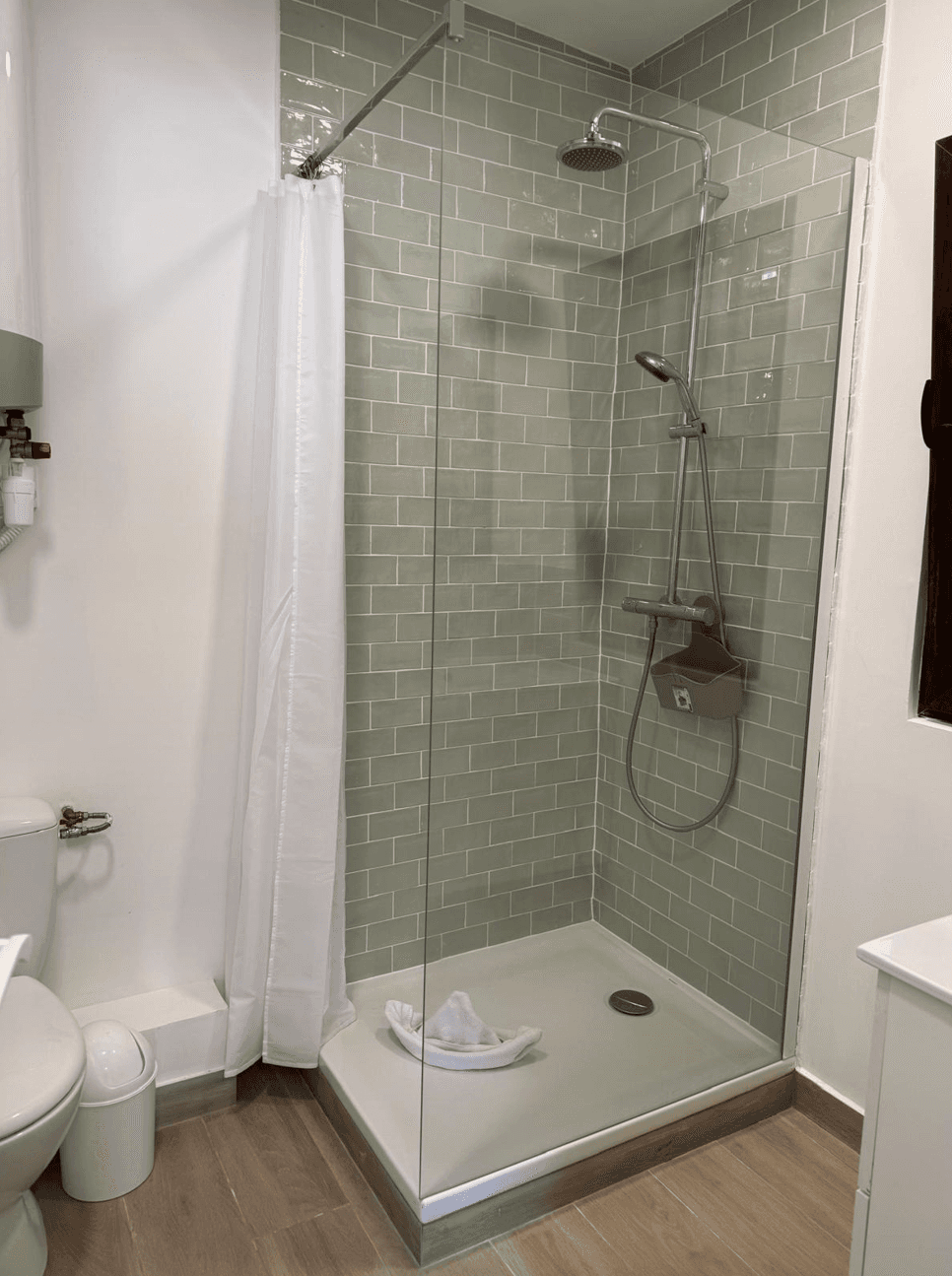 Une salle d’eau avec douche et toilettes.