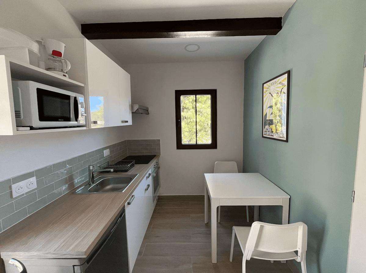 Une cuisine équipée, ainsi qu'une table et chaises.