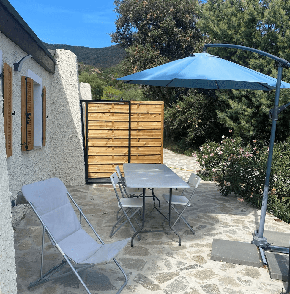 Une terrasse privée aménagée avec chaises longues, table et chaises d'extérieur ainsi qu'un parasol