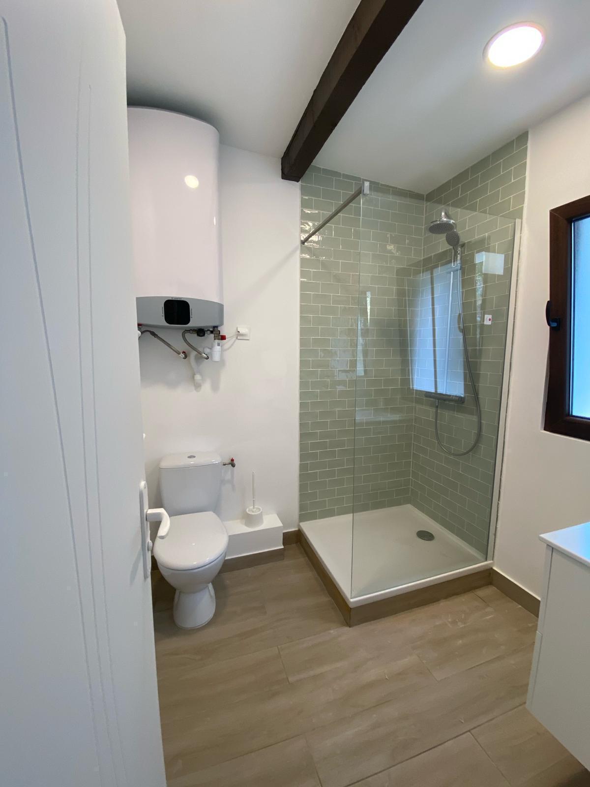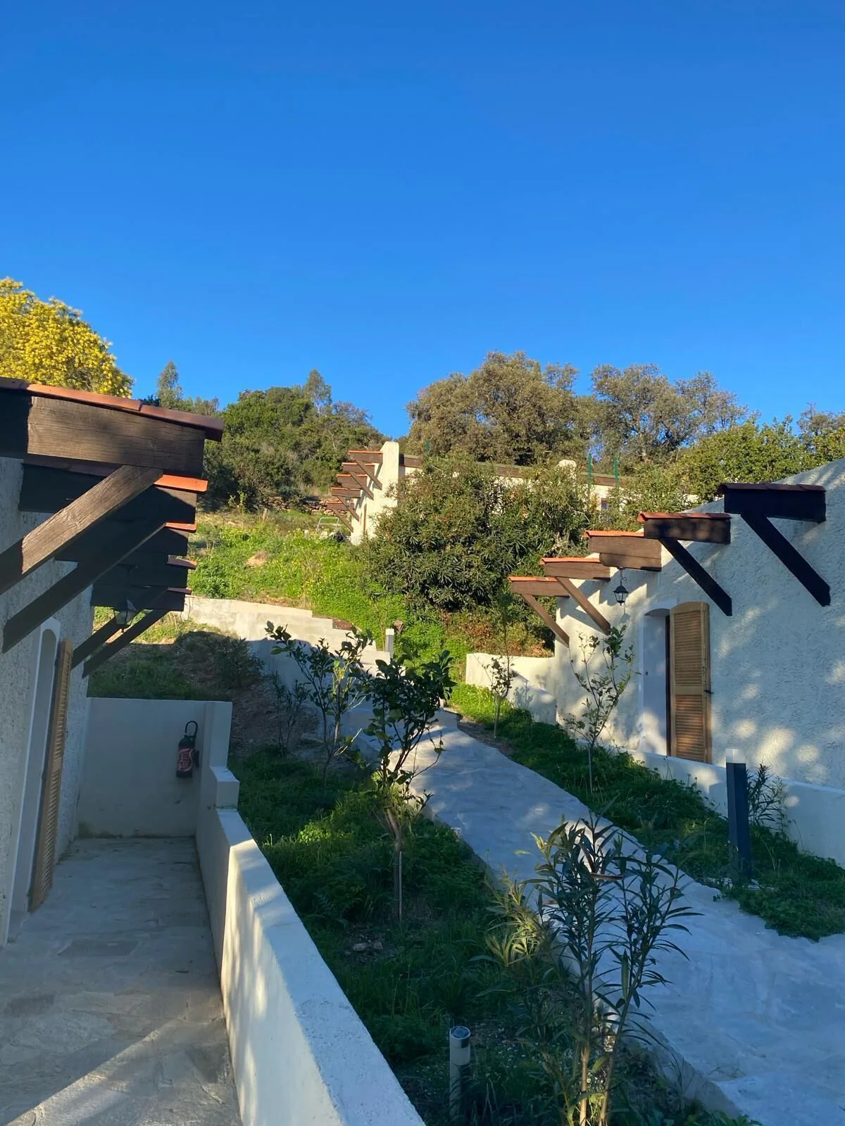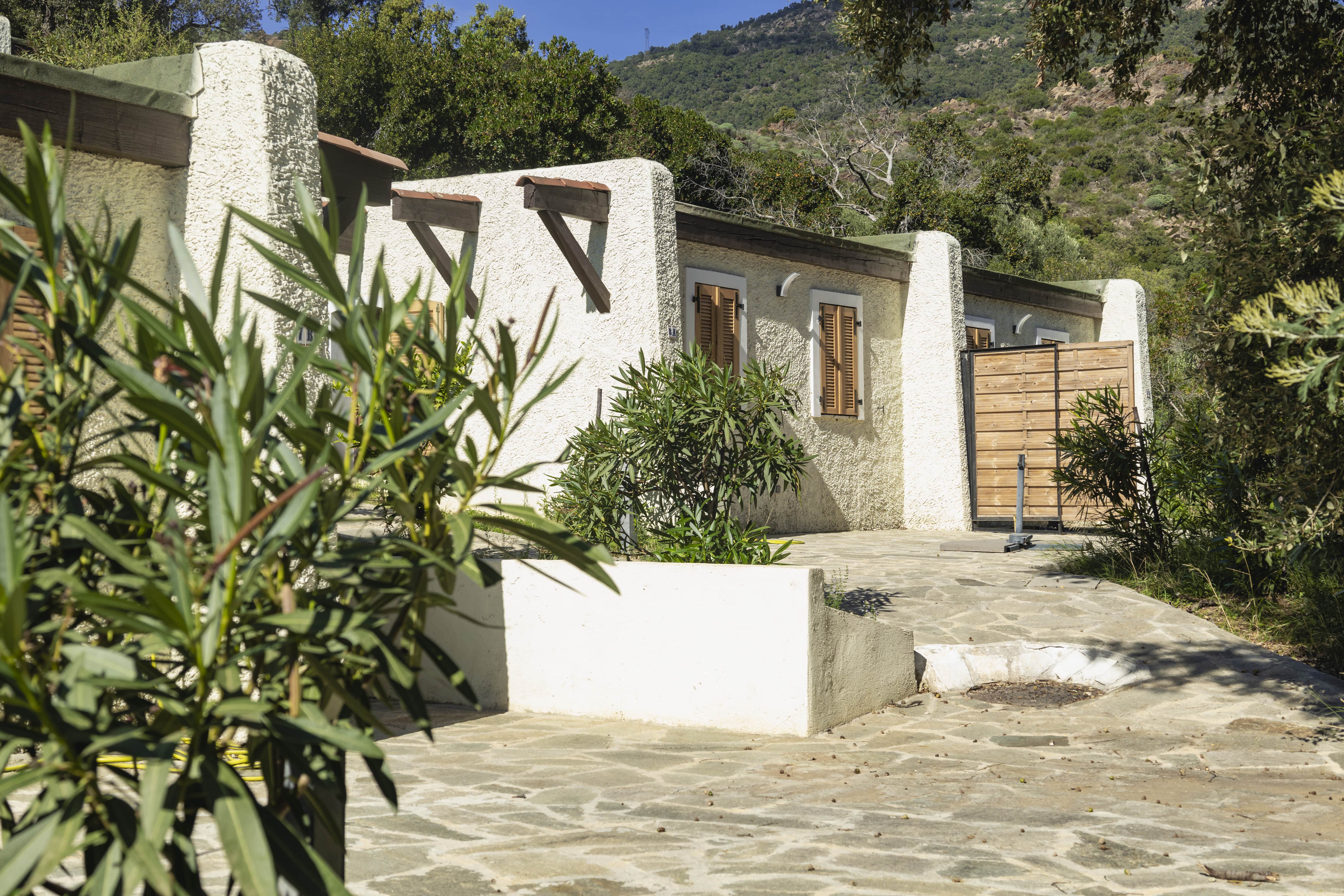 Une terrasse privée, aménagée avec chaises longues, table extérieure et parasol, parfaite pour profiter du calme du hameau et du climat méditerranéen.