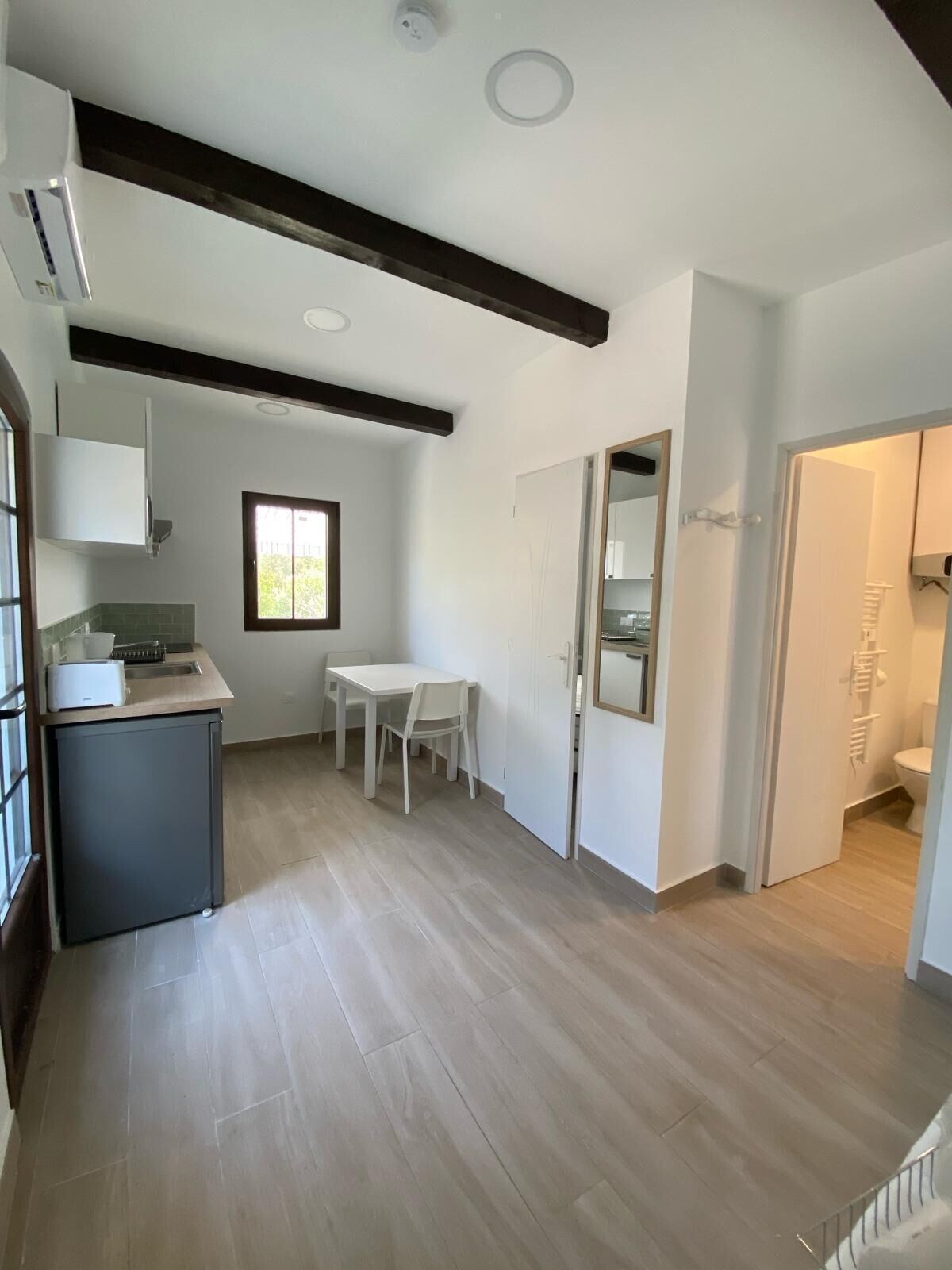 Une cuisine équipée ouverte sur le séjour, ainsi qu’une table à manger.